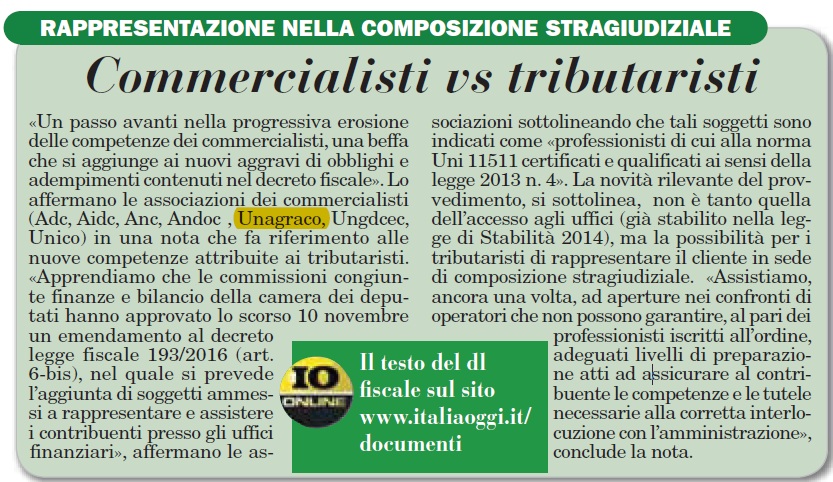 «Apprendiamo che le commissioni congiunte finanze e bilancio della camera dei deputati hanno approvato lo scorso 10 novembre un emendamento al decreto legge fiscale 193/2016 (art. 6-bis), nel quale si prevede l’aggiunta di soggetti ammessi a rappresentare e assistere i contribuenti presso gli uffici finanziari», affermano le associazioni sottolineando che tali soggetti sono indicati come «professionisti di cui alla norma Uni 11511 certificati e qualificati ai sensi della legge 2013 n. 4».