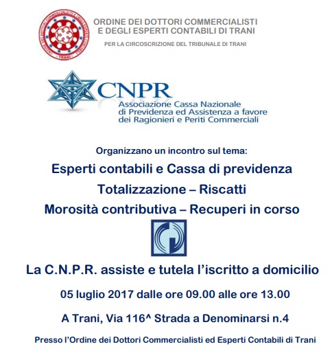 Organizzano un incontro sul tema: Esperti contabili e Cassa di previdenza Totalizzazione – Riscatti Morosità contributiva – Recuperi in corso La C.N.P.R. assiste e tutela l’iscritto a domicilio 05 luglio 2017 dalle ore 09.00 alle ore 13.00 A Trani, Via 116^ Strada a Denominarsi n.4 Presso l’Ordine dei Dottori Commercialisti ed Esperti Contabili di Trani.