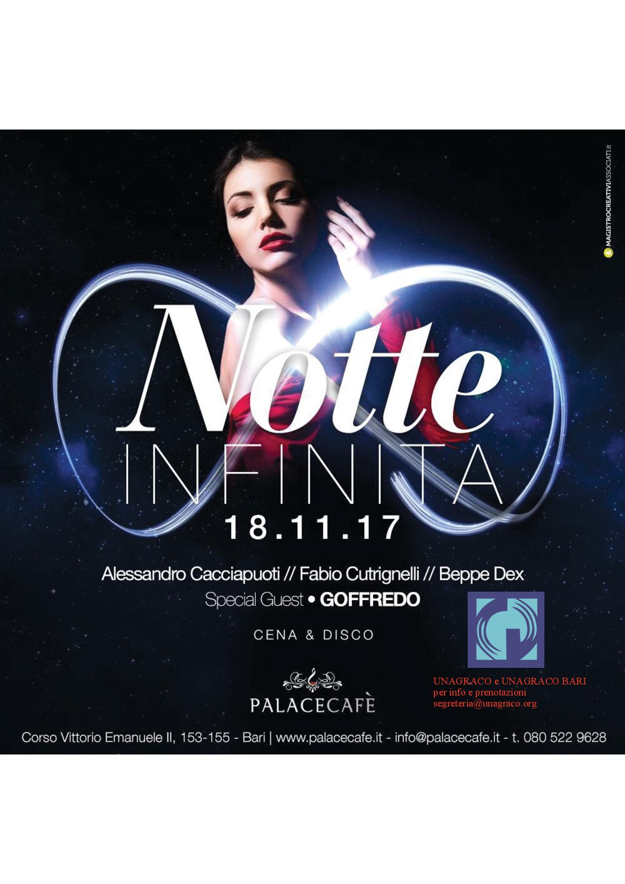 Carissime e carissimi, con piacere vi comunico che il giorno 18/11/2017 presso il Palace Caffè, come UNAGRACO ed UNAGRACO BARI abbiamo aderito all’organizzazione di una serata conviviale che prevederà la cena ed a seguire musica per intrattenersi e divertirsi in spensieratezza.