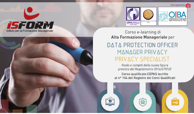 Il corso ISFORM di Alta Formazione Manageriale è pensato per formare consulenti e referenti privacy per le aziende nel settore pubblico e privato o liberi professionisti, che intendano ricoprire il ruolo di Data Protection Officer (Responsabile della protezione dei dati}, Manager Privacy e Privacy Specialist, in conformità al GDPR [Nuovo Regolamento Europeo) entrato in vigore lo scorso 25 Maggio 2018. Il Corso per il “Data Protection Officer’ ‘ fornirà ai partecipanti una preparazione manageriale completa e multidisciplinare secondo quanto previsto dal Regolamento UE per la protezione dei dati personali.